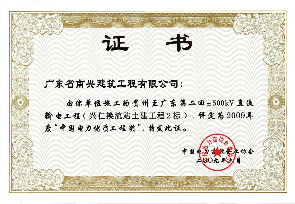 貴州至廣東第二回±500KV直流輸電工程(興仁換流站土建工程2標)獲優(yōu)質(zhì)工程獎(2009年)