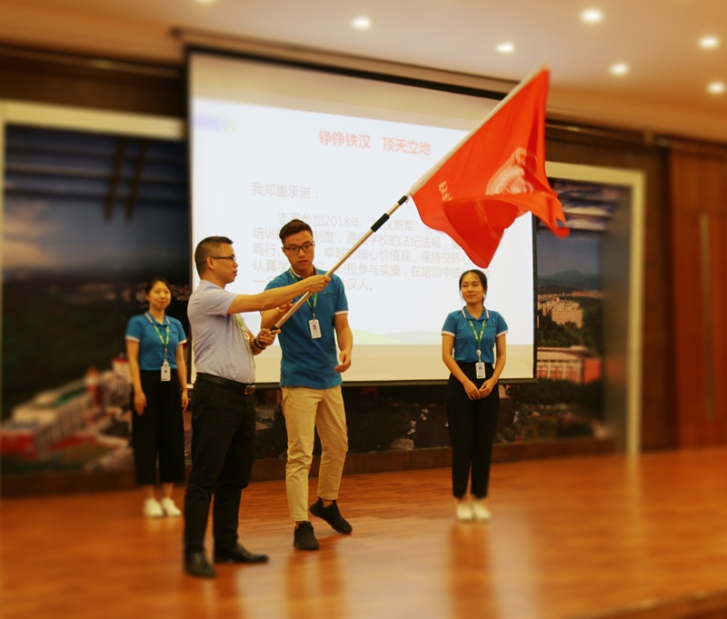 接下來,新學(xué)員代表上臺(tái)宣誓并簽署誓詞,承諾嚴(yán)格遵守培訓(xùn)要求、秉承鐵漢核心價(jià)值觀,認(rèn)真學(xué)習(xí)、積極參與,在培訓(xùn)中自我成長(zhǎng)。樊杜平接過新學(xué)員簽署的承諾書并授旗,與全體參會(huì)人員及學(xué)員齊唱《鐵漢之歌》。